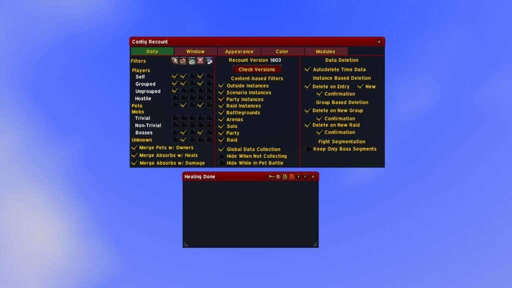 Recount serves the same purpose as Details!, but is much simpler. For healers, it can track healing done, absorbs, healing taken, overhealing done, HoT uptime, mana gained, and dispels. It can also track damage done, damage taken, CC breaks, and a few other data points. There are fewer customization options than Details! has, but for the average user it’s probably plenty. Recount also lacks a threat meter, but a standalone threat meter can be installed separately.