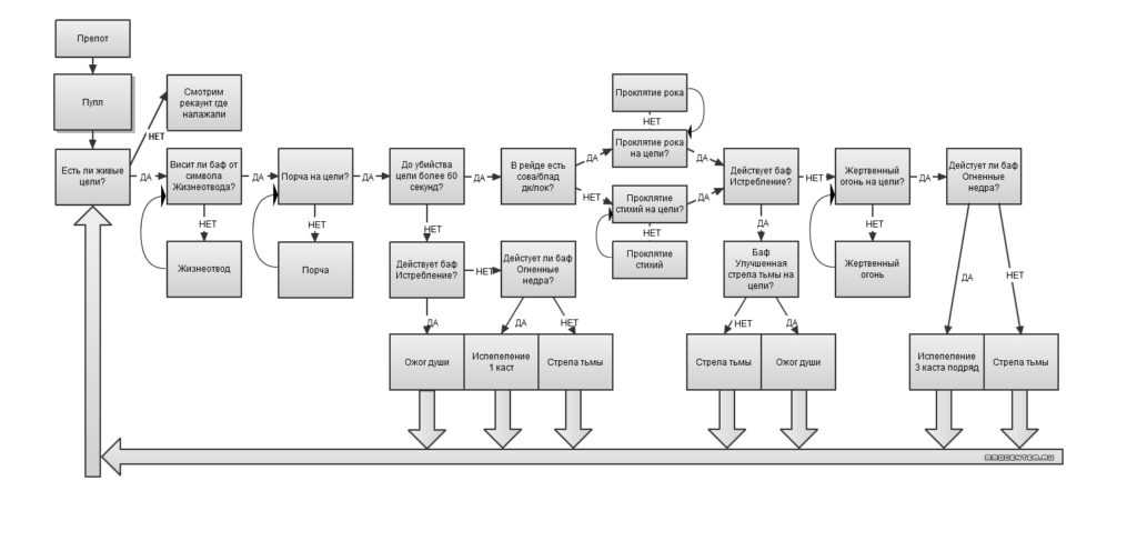 Всегда, после окончания старайтесь обновлять Жертвенный огонь, но не обрывайте последний тик. Поджигание и Стрелу хаоса используйте, когда закончится КД. Остальное время спамим Испепеление. Порча используется только при перебежках.