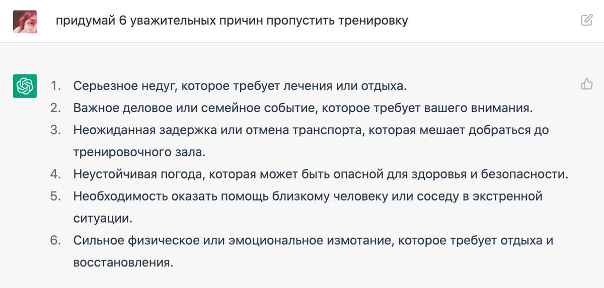 План питания и тренировок. Расскажите чат-боту о своем весе, росте и возрасте, а потом укажите, на сколько хотите похудеть. ChatGPT рассчитает вашу норму калорий в день и подготовит детальный план питания. Выберите продолжительность тренировок, цель — и получите расписание со списком упражнений.