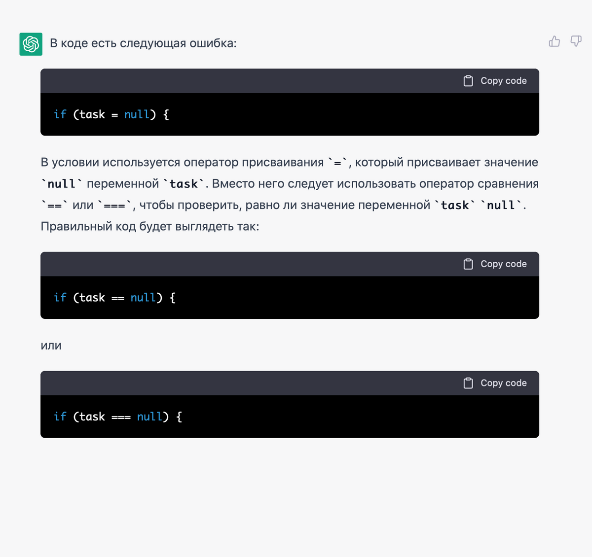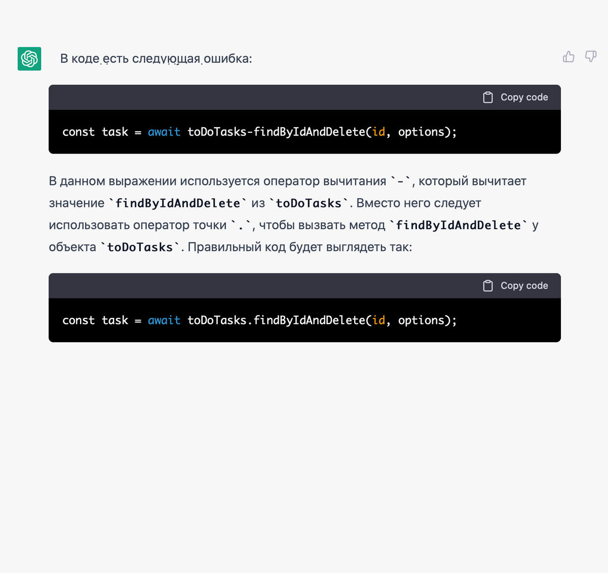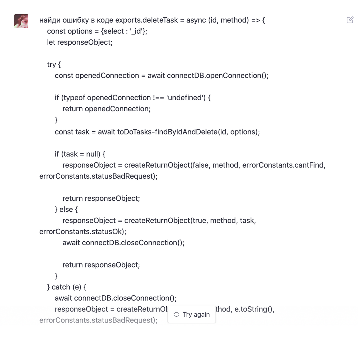 Как написать код. ИИ рассказывает, как выполнить определенную операцию или придумать процесс. Он может найти баги в части кода или перевести код из одного языка программирования в другой. Мы добавили две ошибки в код и попросили ChatGPT найти их — бот справился с заданием. В соцсетях отмечают, что ИИ может стать отличным помощником для поиска багов.