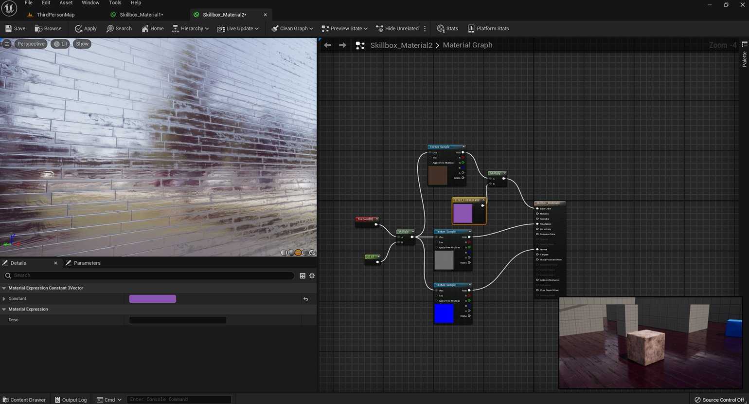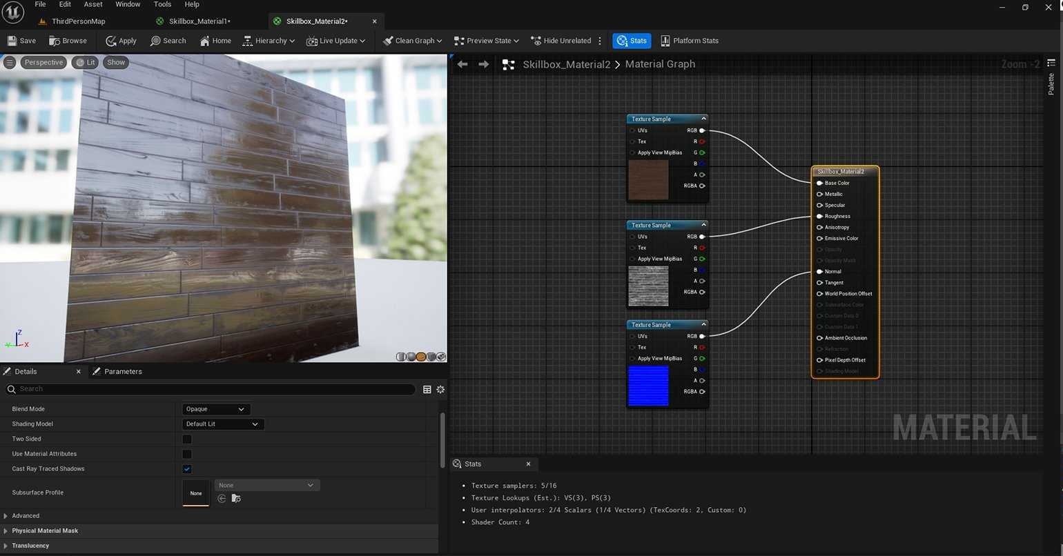 В качестве примера мы выбрали три текстуры T_Wood_Floor_Walnut из набора Starter Content. Перетаскиваем их в Material Editor и соединяем. Также можно экспериментировать с сочетаниями текстур и слотов и получать различные эффекты без подключения дополнительных нодов.