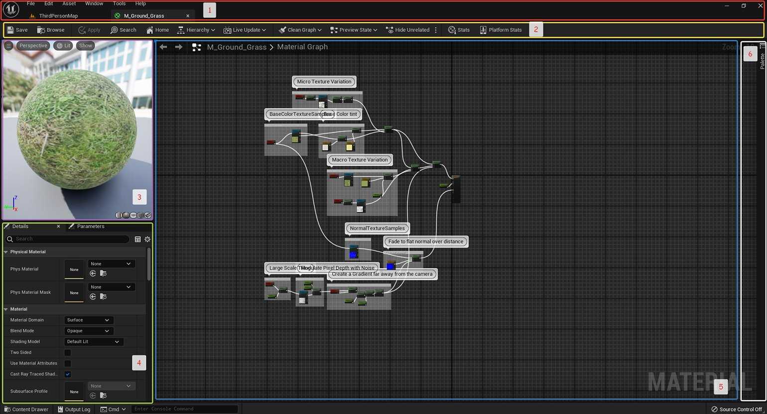 Большинство операций в Material Editor происходит в окне графа материалов — Material Graph (на изначальном скриншоте — №5). Это пространство для сборки нодов-компонентов. По умолчанию в Material Graph есть только один главный нод с большим количеством слотов-свойств, к которым пользователь «подключает» дополнительные ноды и формирует поверхность материала.