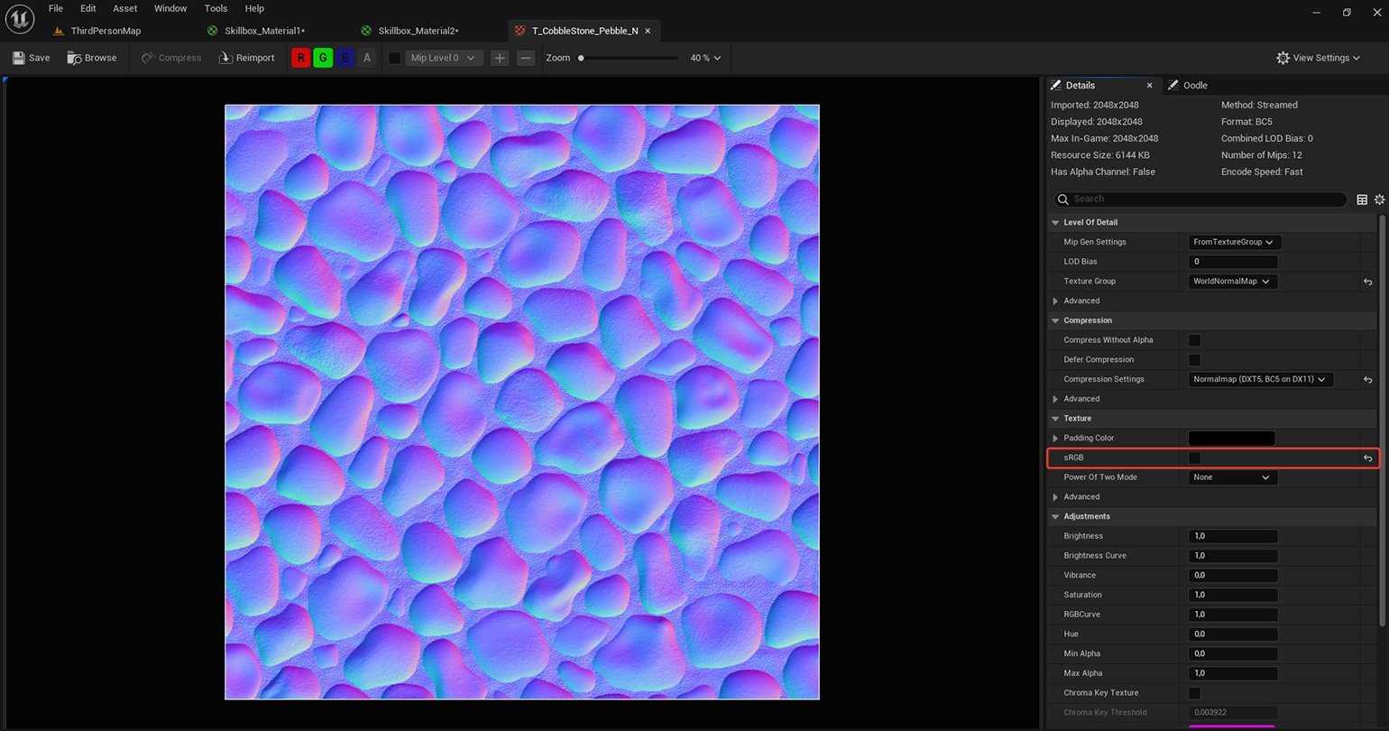 Окно текстуры (вызывается двойным кликом ЛКМ). Красным выделен пункт, который не должен быть отмечен галочкой, если это карта нормалейСкриншот: Unreal Engine / Epic Games