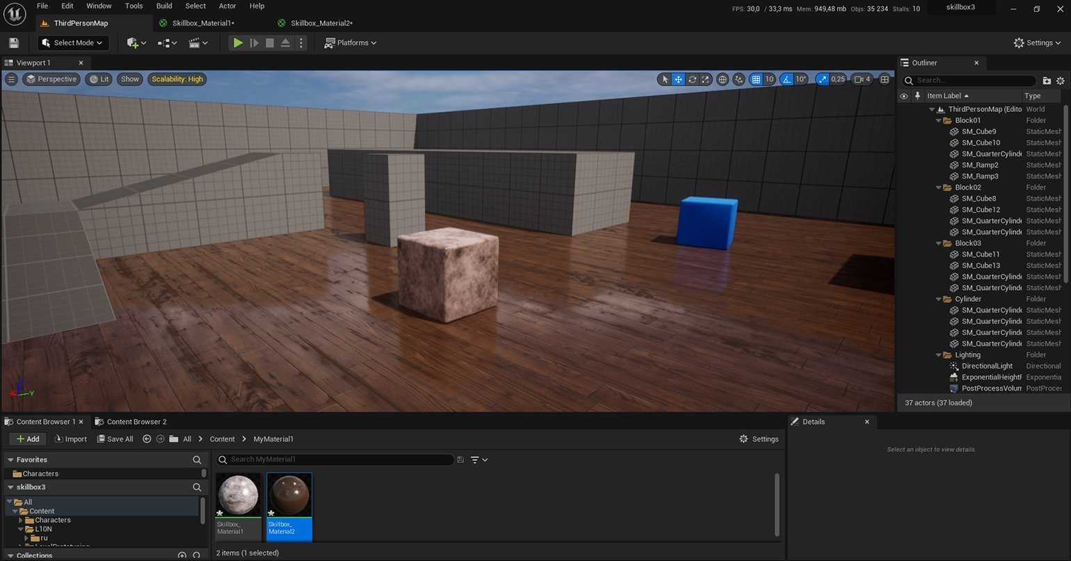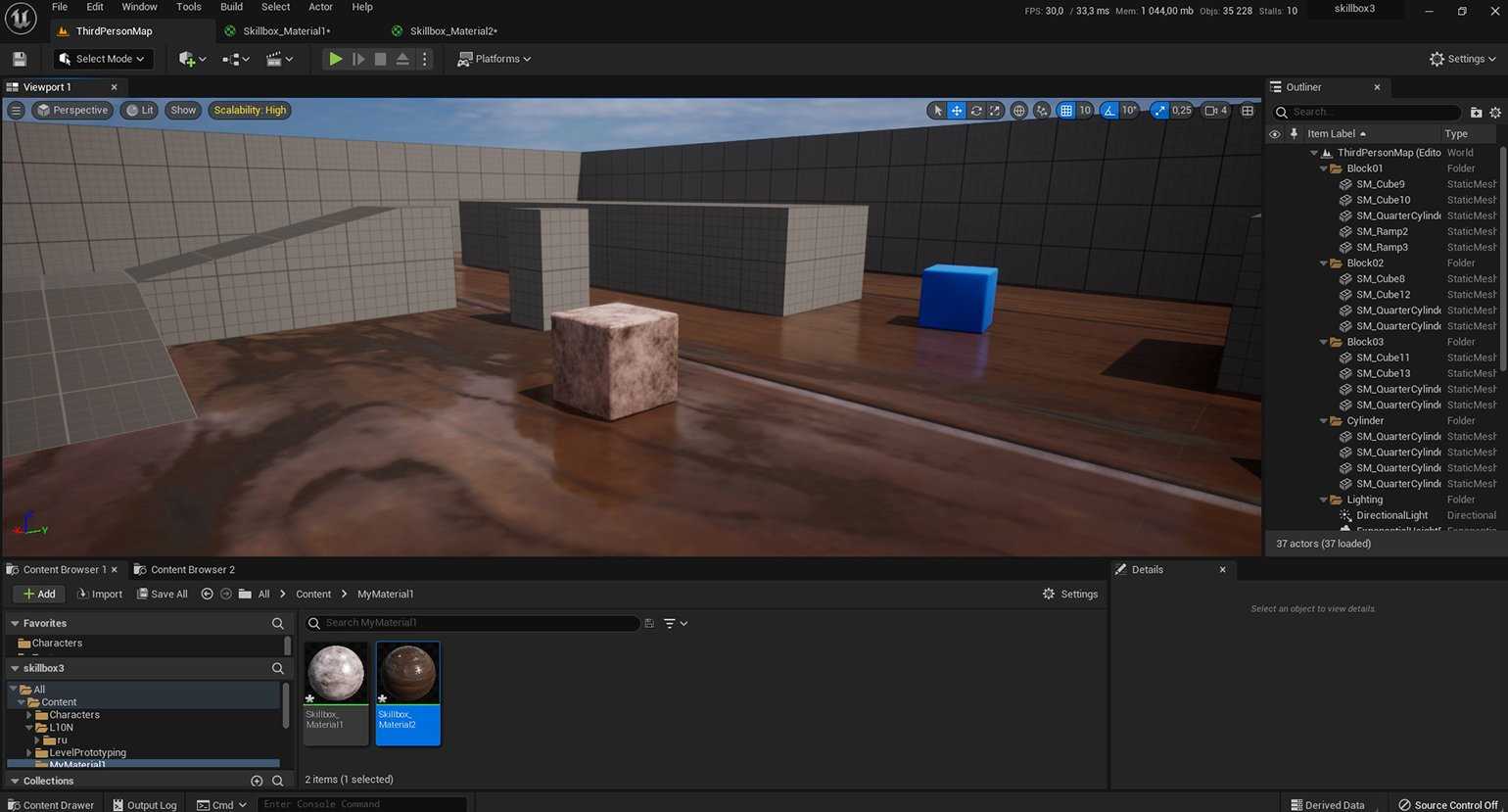 При просмотре обновлённого материала во вьюпорте кажется, что узор текстуры стал слишком мелким. Нажимаем Apply, заходим в сцену и видим, что видоизменённый материал смотрится вполне гармонично в контексте напольного покрытия в сцене шаблона Third Person.