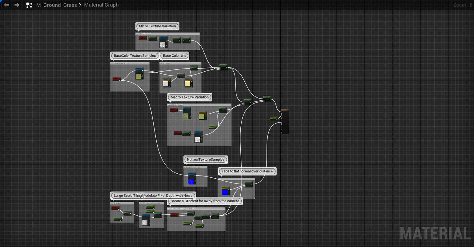 На схеме видно, как большие группы нодов связаны с основным нодом материалаСкриншот: Unreal Engine / Epic Games