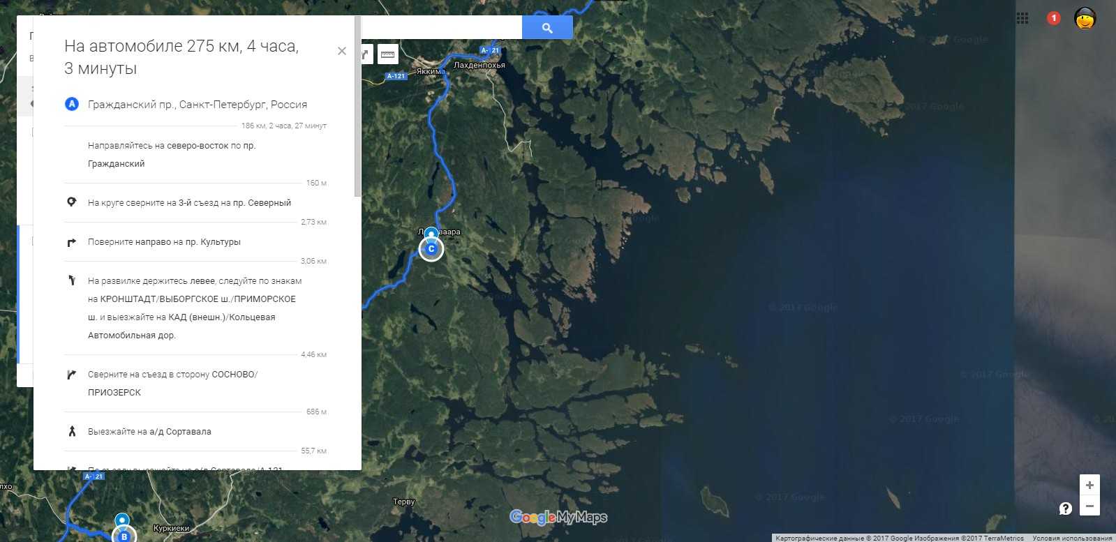 В открывшемся окне, напротив строки «А», указываем адрес начала маршрута и нажимаем Enter. Гугл построит маршрут с учётом доступных дорог, грунтовок и подъездов.