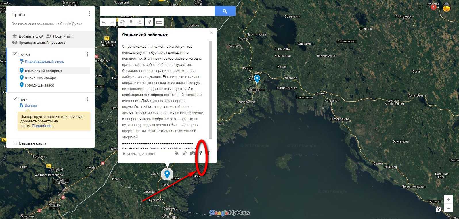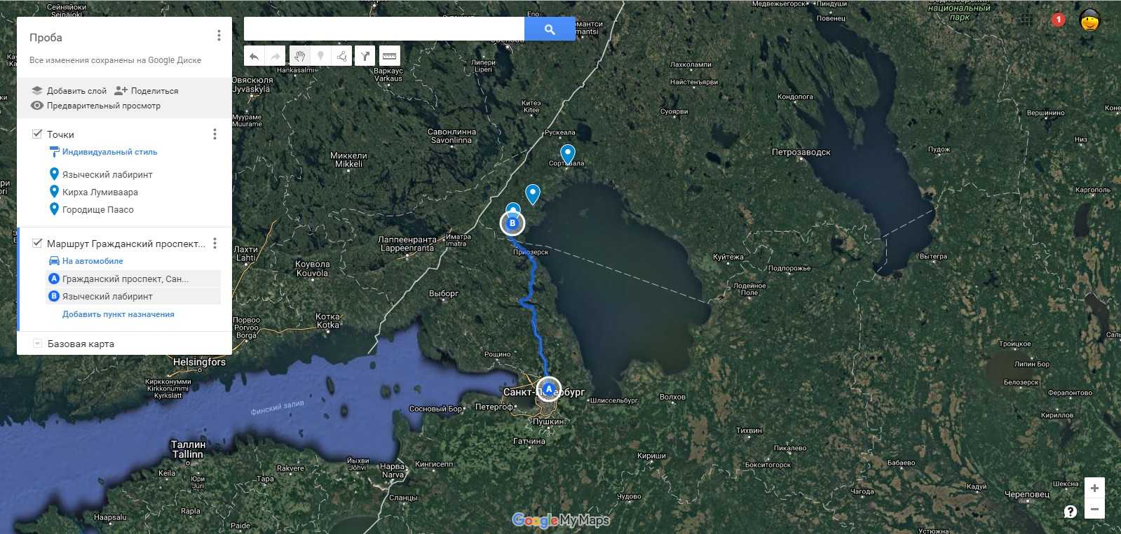 Готово! Трек построен. При необходимости, Вы можете посмотреть примерное расстояние и время в пути, нажав на пункт «меню» (три вертикальные точки справа от имени слоя) и выбрав раздел «детали маршрута».