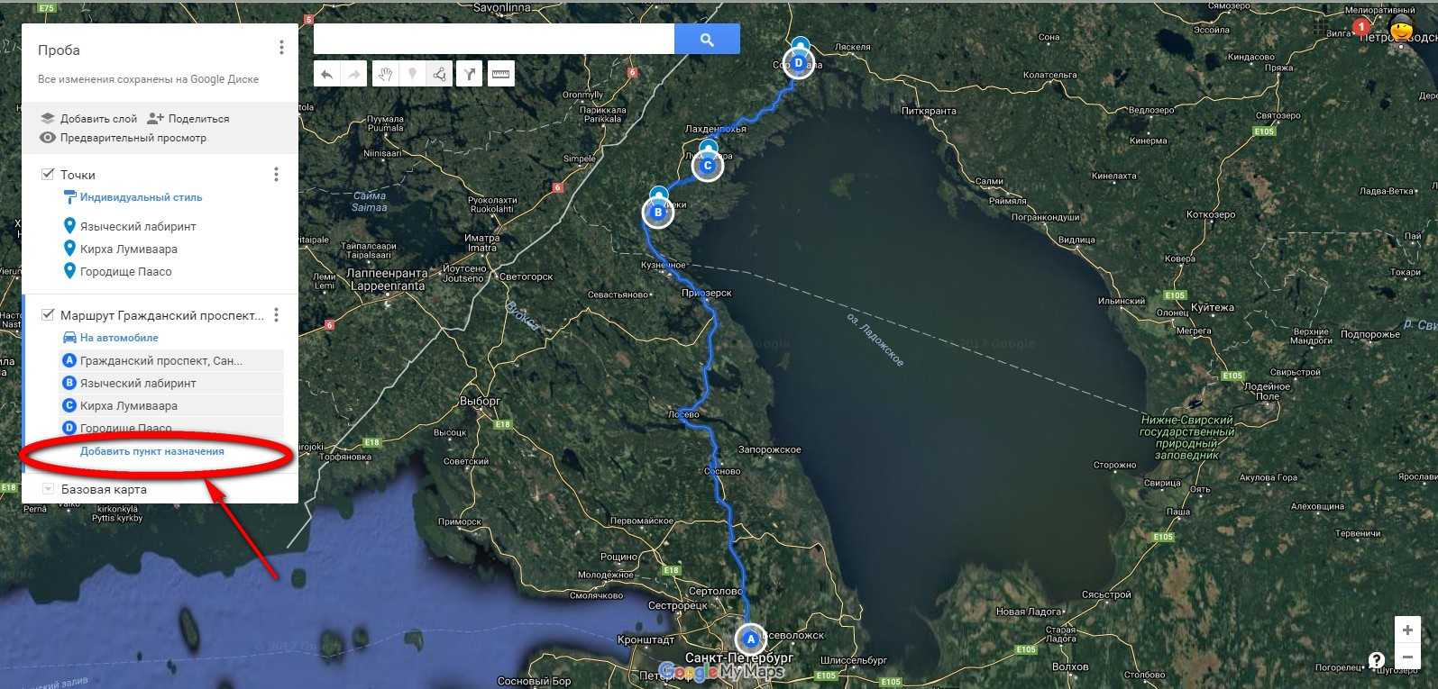 Для построения дальнейшего маршрута, нажимаем пункт «добавить пункт назначения» и просто выбираем мышкой следующую точку. Повторяем действия для всех объектов.