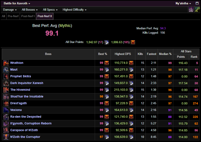 Вы могли заметить ещё одну вещь на этой странице — All Star Points. Это показатель для оценки эффективности в бое с боссом, в котором персонаж сравнивается с лучшим игроком в этой специализации, который имеет 120 очков (это максимум).