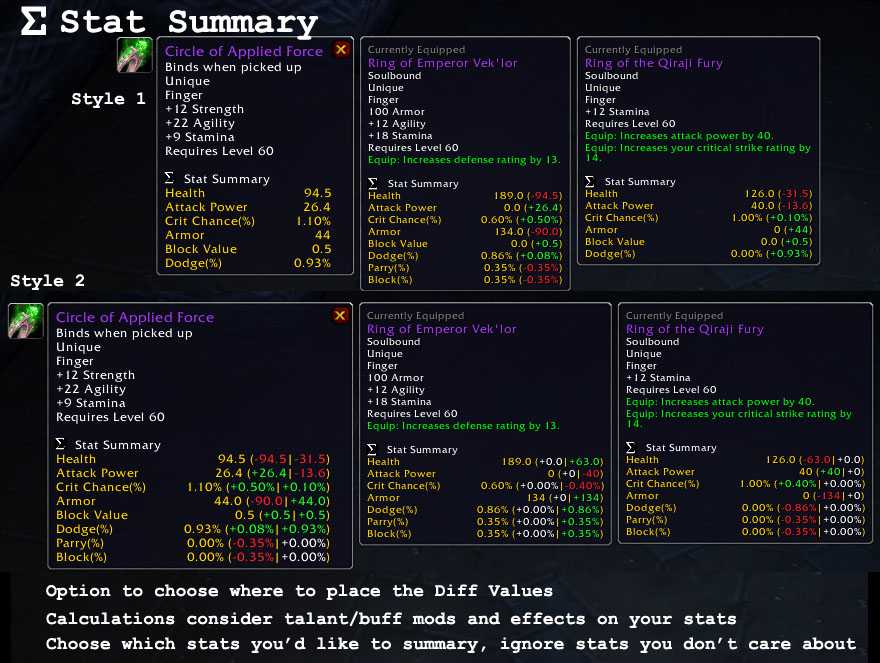 Сводная статистика:Суммирует всю статистику самого предмета, чар и драгоценных камней, преобразует их в базовую статистику и отображает общую стоимость и / или разницу с вашим текущим снаряженным предметом.