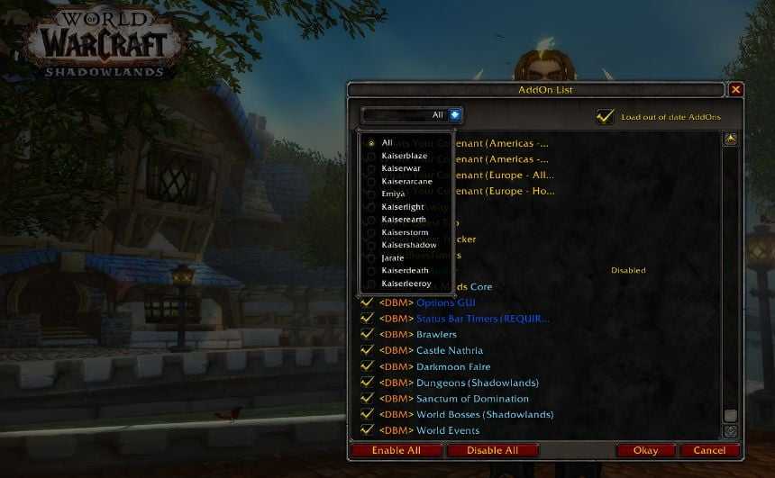 You can also manage which addons you want to load for your characters through this menu. If you want to disable an addon temporarily, simply uncheck it. You can also click on the drop-down menu at the top-left and selectively choose which addons you want active per character, which is excellent for some class-specific addons.