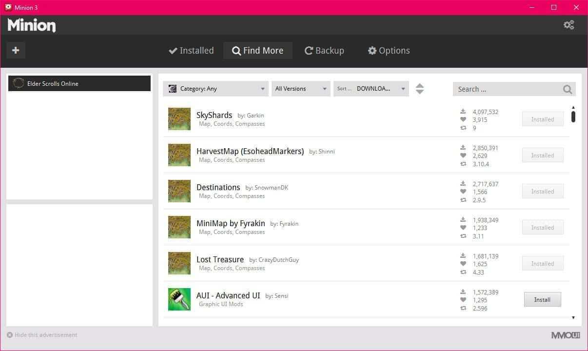 There’s 4 tabs in Minion, your Installed addons, a tab labeled “Find More” which lets you search addons from esoui.com directly from Minion, a Backup option to transfer your addons and settings in another system, and some basic options.