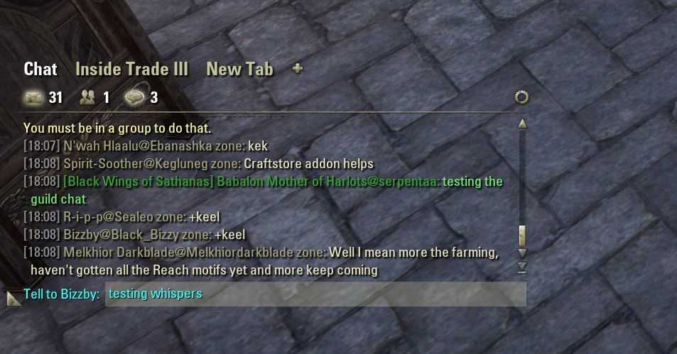 Tip: The hardcore socials might want to check out on TOM (Tamriel Online Messenger), as it lets you keep a separate tab for all your whispers and private interactions, so you never have to scroll & search for your friends’ chat or multiple WTS’s.