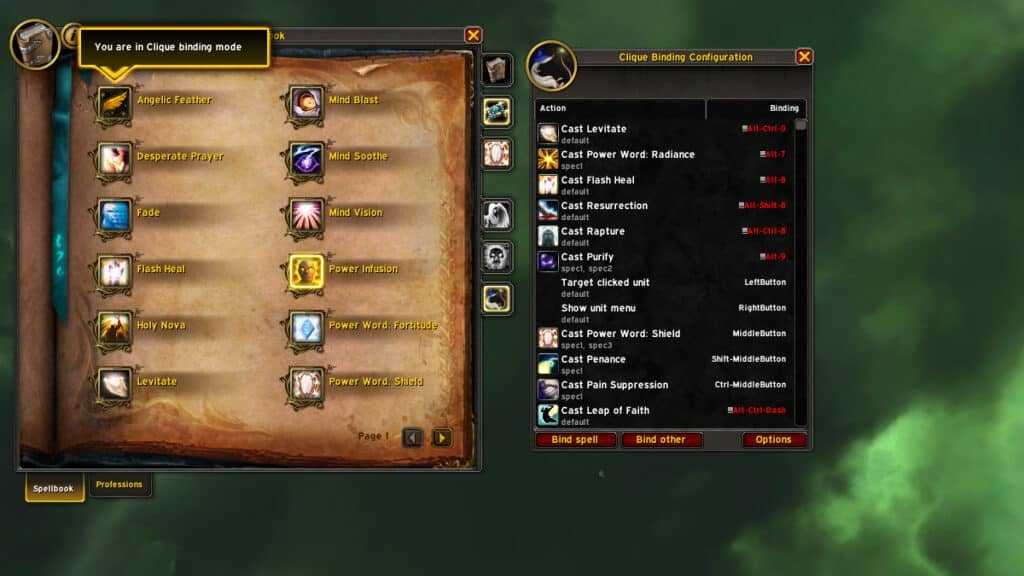 Since mouse binds are all that Clique does, it does it especially well: you can set up a binding by opening your spellbook and clicking on a spell using the keybind you want to set. It also works with macros.
