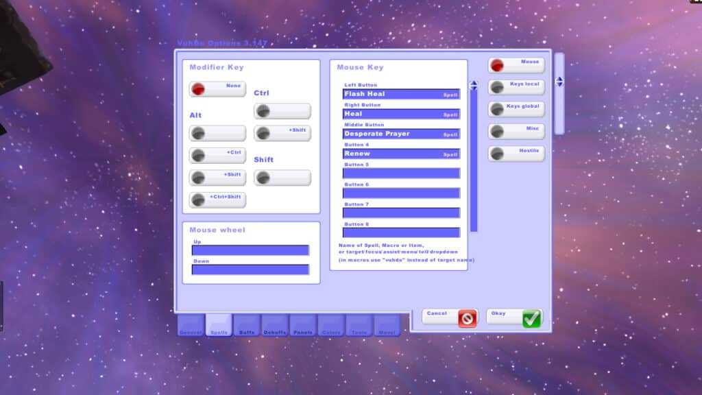 VuhDo’s mouse binding options are robust, allowing you to set up mouseover macros by simply typing in the name of the spell. Modifier keys, extra mouse buttons, and the mouse wheel can all be used. There are options to automatically cleanse, buff, or resurrect targets you click on when certain conditions are met. You can also set it to automatically use trinkets, glove enchants, or any instant spell, and these will be used on cooldown when you use your other mouse binds.