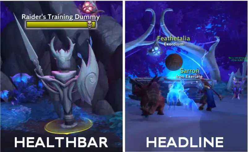 Here is an example of a healthbar on a training dummy and headlines on friendly players.