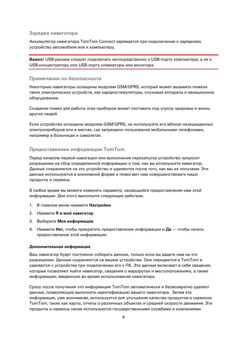 Зарядка навигатора, Примечание по безопасности, Предоставление информации tomtom