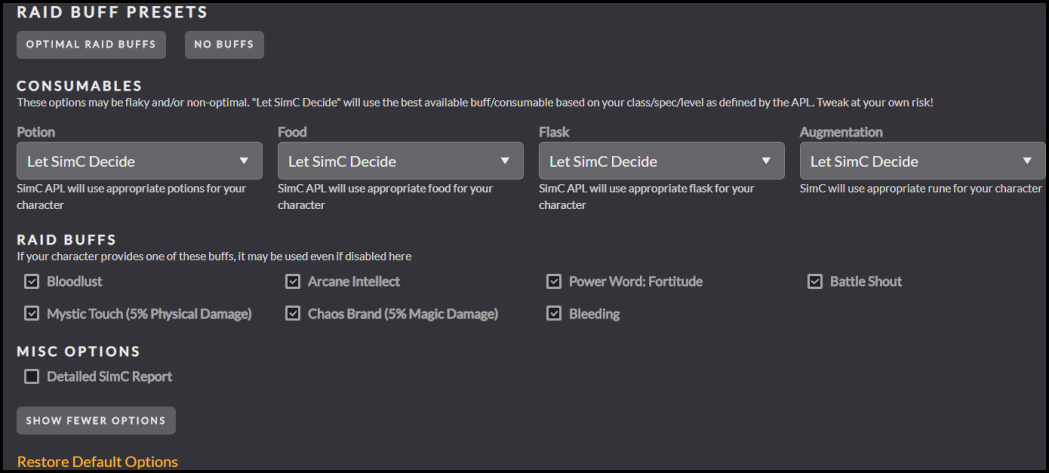 Consumables: в этом разделе можно выбрать интересующую вас еду, настой , зелье и руну усиления. Вы также можете использовать настройки по умолчанию, и симуляция будет использовать параметры, заданные шаблоном для вашего класса/специализации, либо вы можете отключить все усиления.