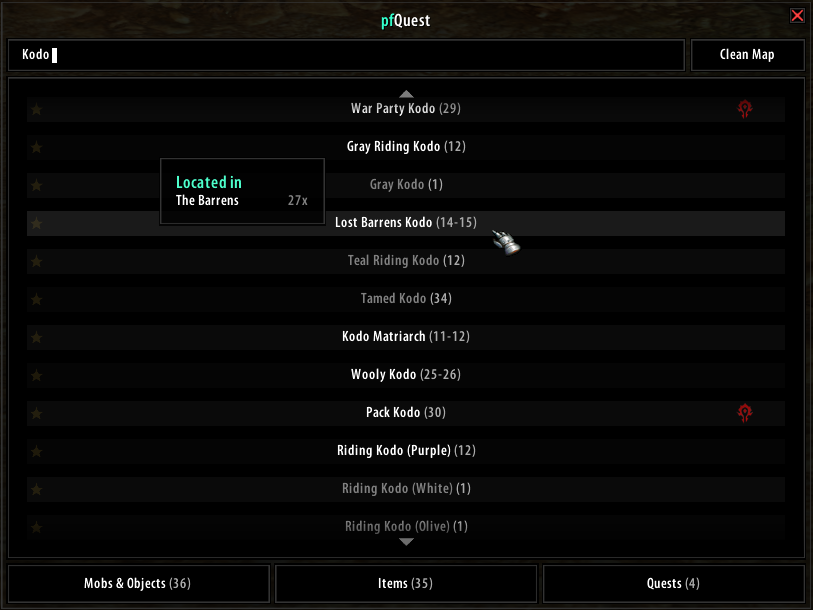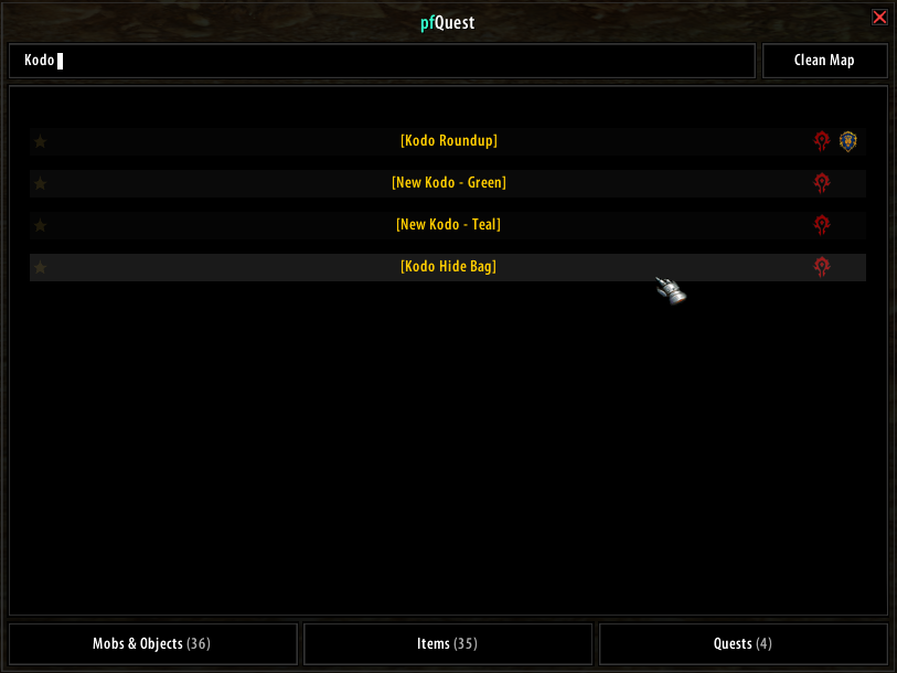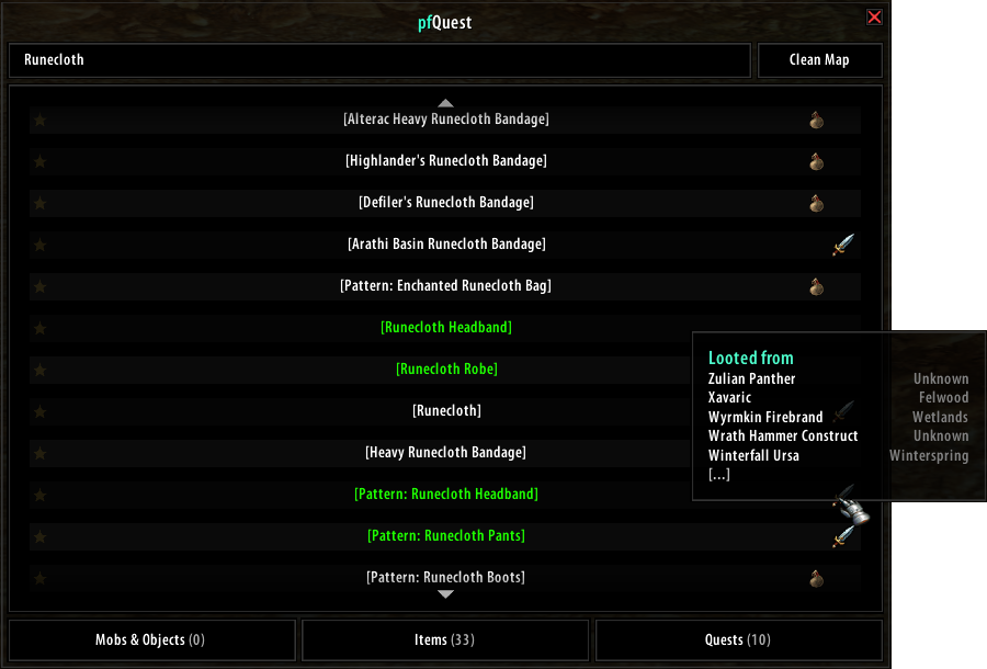 The database GUI allows you to bookmark and browse through all entries within the pfQuest database. It can be opened by a click on the pfQuest minimap icon or via . The browser will show a maximum of 100 entries at once for each tab. Use your scrollwheel or press the up/down arrows to go up and down the list.