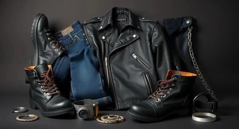 - Мото-стиль: кожаные куртки, ботинки, брюки.