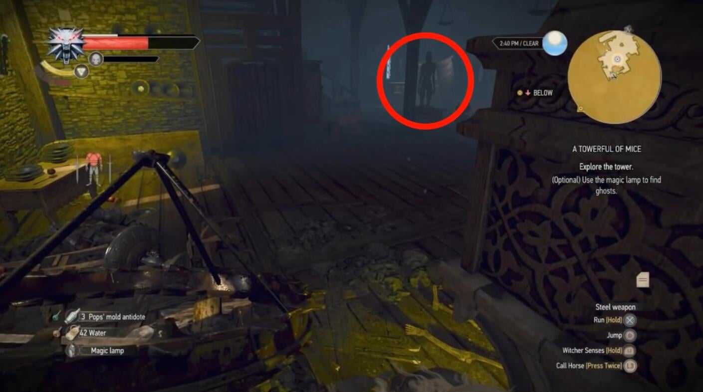 Во время прохождения второстепенного квеста «Мышиная башня» в Велене Геральт может услышать ужасающие женские вопли неизвестного происхождения. Позже внимательные игроки обнаружили, что если встать в определенной точке башни, на долю секунды вдали комнаты появится загадочный силуэт – и тут же исчезнет.