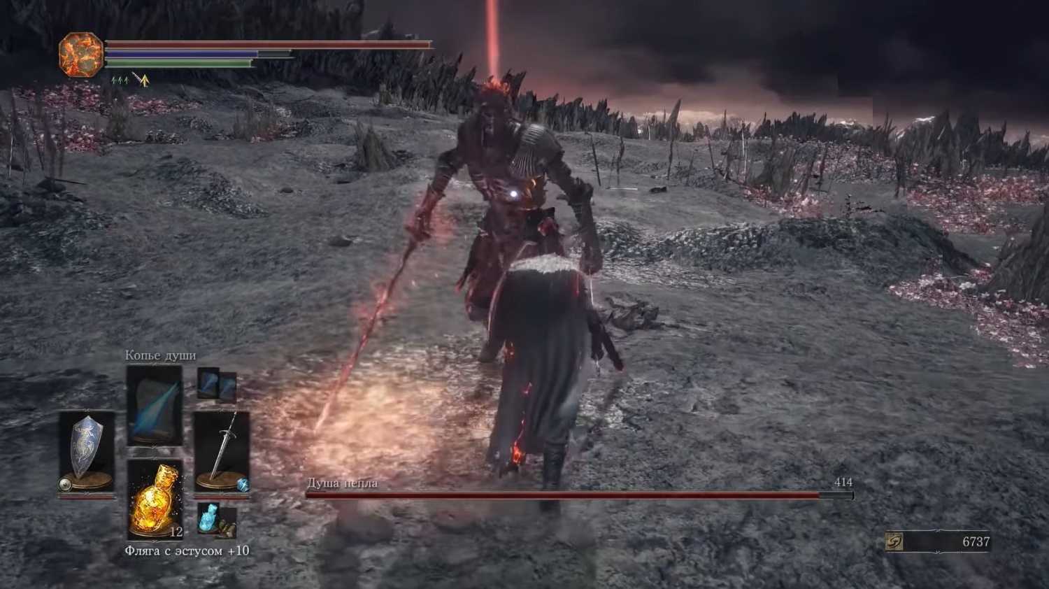 Битва с Душой потребует высокой скорости реакции, потому что враг будет преследовать игрока, не давая возможности похиллить себя. Используем щит и увороты. Стараемся зайти за спину в тыл и ударить со спины.