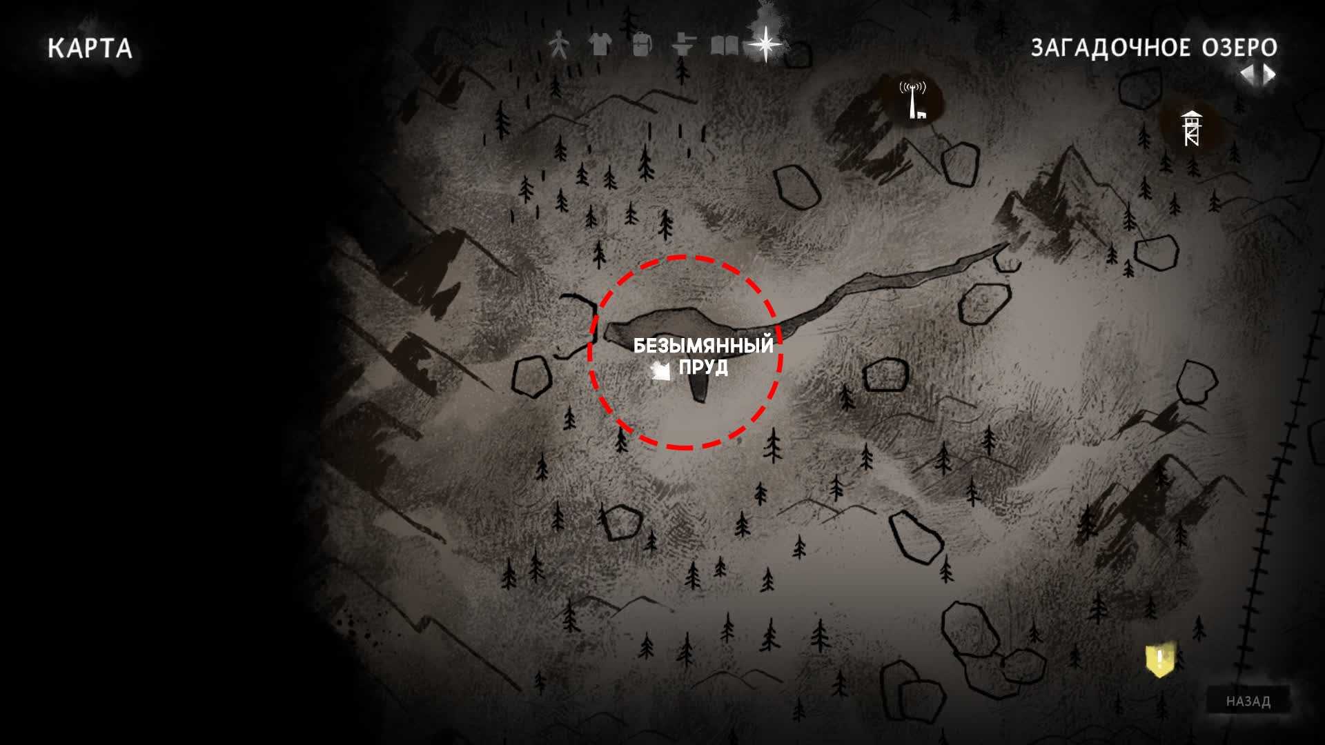 Между домом зверолова и вышкой лесника находится безымянный пруд. Среди других локаций района пруд особенно выделяется возможностью обнаружить в охотничьей засидке случайную книгу навыков и лук для выживания со стрелами, который практически нигде больше на «Загадочном озере» не генерируется. Кроме того, местность богата натуральным лутом: грибами Рейши, луговой тимофеевкой и старым высохшим мхом. Также по льду бегают олени, изредка встречаются и кролики. На восточной стороне пруд плавно перетекает в замёрзший ручей, фактически служащим исключительно для лучшего ориентирования.