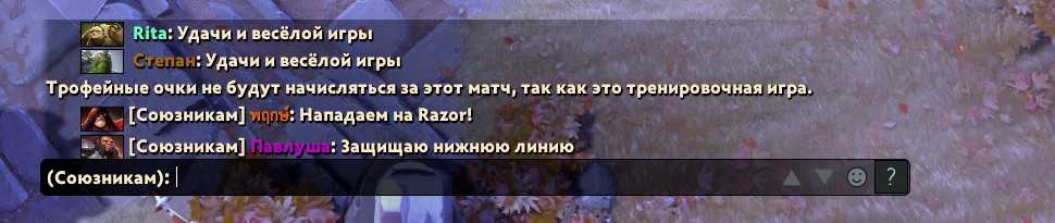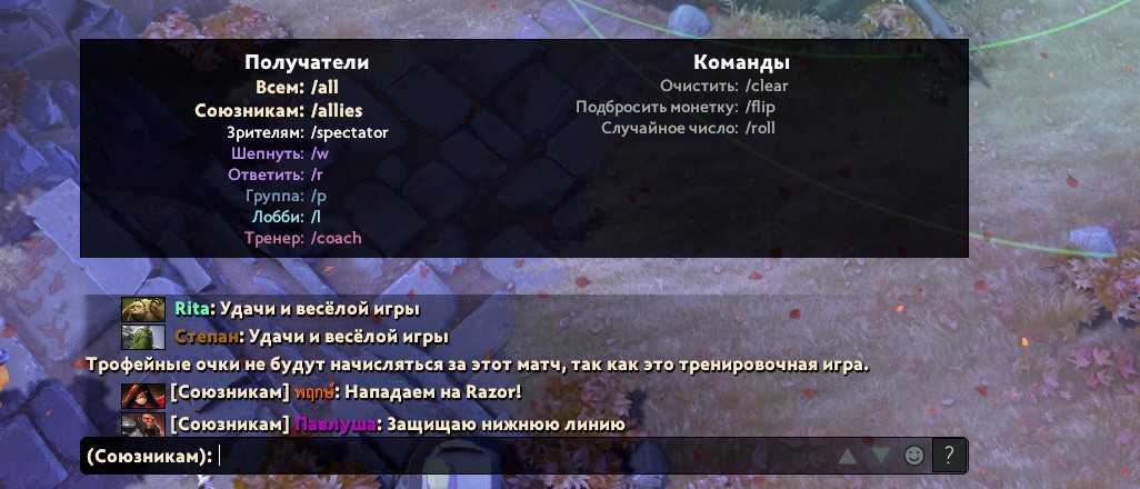 Например, «Паззлер уходит в кусты» или «Осторожно, враги прорвались к верхней башне». Это поможет вашим союзникам быть в курсе ситуации и принимать соответствующие меры