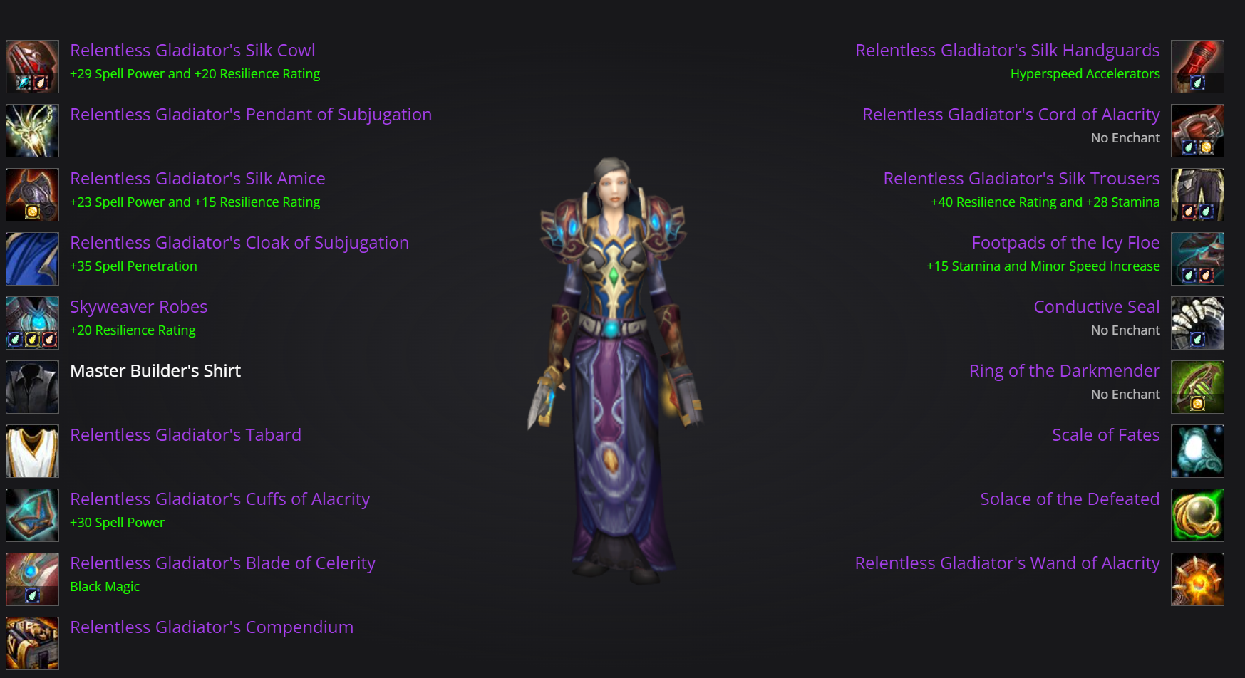 Helm: +29 Spell Power +20 ResilienceShoulders: +23 Spell Power +15 ResilienceBack: +35 Spell PenetrationChest: +20 ResilienceBracers: +30 Spell PowerGloves: Hyperspeed AcceleratorsLegs: +40 Resilience +28 StaminaBoots: +15 Stamina and Speed IncreaseWeapon: Black MagicThe only thing that may stand out to some is the Earthen Leg Armor instead of Sapphire Spellthread. While more damage is usually the way to go, this expansion is very fast-paced, and the amount of Resilience the Leg Armor gives early in the season is almost more than main pieces, so it is very valuable.