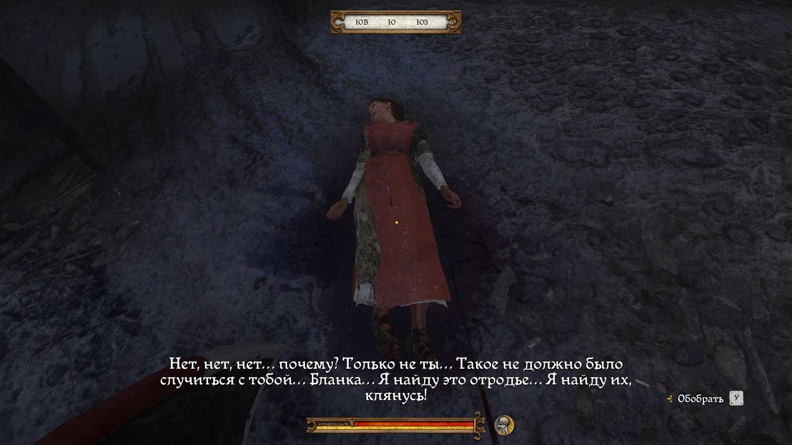 Для начала не забудьте наведаться к корчме, где вы обнаружите труп возлюбленной Индржиха – Бланки, у которой вы сможете взять, а потом и одеть ее кольцо и бутылку Спасительного шнапса (Это кольцо в последствии можно будет подарить девушке, чтобы улучшить ее расположение). Найти родителей Индржиха вы сможете в центре города, после чего начнется кат-сцена, где главный герой изольет все свои чувства.