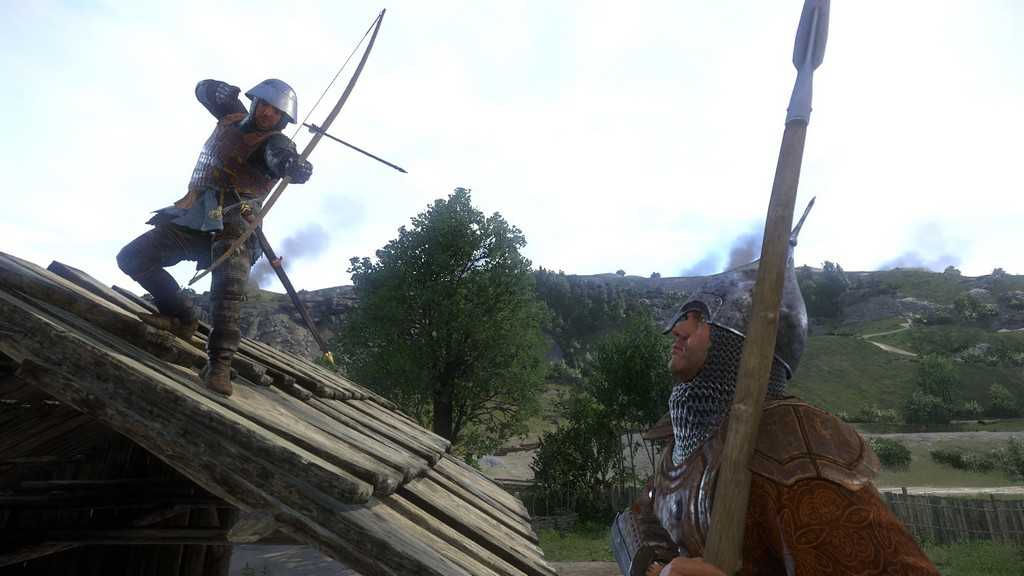 Половецкий лучник, начав натягивать тетиву одновременно с вами, отпустит ее на полсекунды-секунду раньше. Потому совет: если лучник один, лучше увернитесь, а до двух-трех стреляющих одновременно лучше вообще не доводить (вариант на крайний случай – спрятаться за коньком крыши). Стрейфимся на момент вражеского выстрела, это можно делать, натягивая свой лук, в таком случае половец наверняка промахнется. Деревянный навес это позволяет. Генри в половецком доспехе держит попадания стрел относительно неплохо, но злоупотреблять этим не стоит. Два лучника одновременно стреляющие в вас больше похожи на пулемет: хоть урон от каждой стрелы небольшой, но стамина почти не восстанавливается и натянуть свой лук вам не дадут, рано или поздно получите хедшот или кровотечение и тогда уже точно не вывезете.