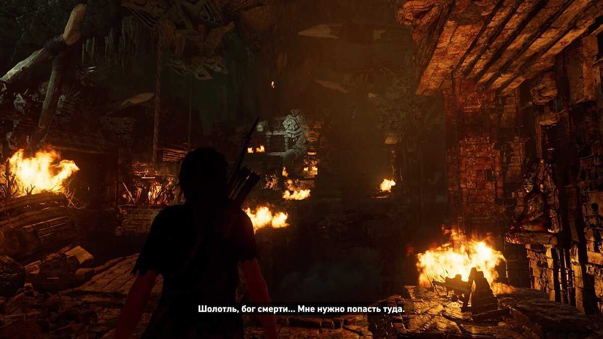 Идите вперед. В конце пещеры будет крутой спуск, после которого нужно успеть прыгнуть и ухватиться ледорубами за скалу. Спуститесь по веревке, раскачайтесь и прыгайте на небольшую площадку. Ухватитесь за уступ в стене и спускайтесь еще ниже. Подойдите к небольшому отверстию в стене чтобы Лара проползла. После очередного спуска вас ждет поединок с несколькими животными, похожими на лис. После боя изучите фреску и подойдите к обрыву с горящей нефтью. При помощи лука соорудите веревочный лаз.