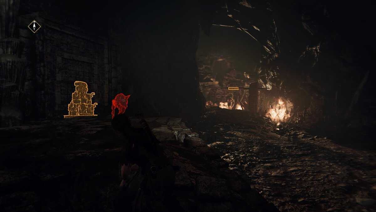 Вам нужно спускаться ниже и ниже, упасть в воду и обойти все развилки. Во время прыжка конструкция развалится. Так и должно быть. По пути вам встретится труба с водой, закрывающая горючую конструкцию – просто перекиньте зажигательную смесь через верх. Дальше вас ждет головоломка. Надо прыгнуть на дальний противовес и сломать пути. Подняться выше и выстрелить стрелой с веревкой в механизм, таким образом вытащив вагонетку. Дальше перепрыгнуть через штырь в стене на другую сторону и подняться наверх. Рядом со столбом выстрелить стрелой с тросом в вагонетку. Спустится вниз, прыгнуть на противовес, и вагонетка закроет источник воды. Киньте зажигательную смесь в открывшуюся горючую преграду. Прыгайте внутрь и забирайте навык Зоркие Глаза – он дает вам возможность видеть ловушки. Возвращайтесь назад.