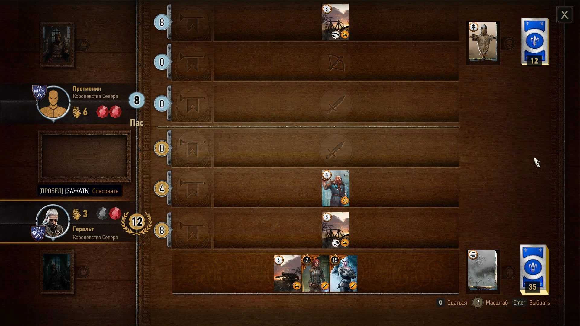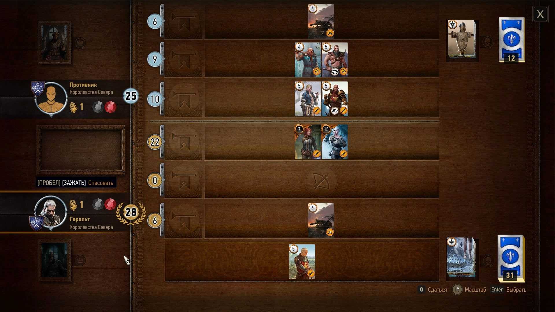 Второй раунд я начал с выставления симметричного по силе осадного отряда и завершил его с минимальным перевесом по очкам после того, как противник спасовал. Ну а в третьем раунде осталось выставить припасенные напоследок мощные карты героев, добавить отряд средней силы — и даже получилось рискнуть, подкинув противнику взятую из колоды за предыдущую победу карту шпиона и скомпенсировав его полученной взамен идентичной по силе картой отряда.