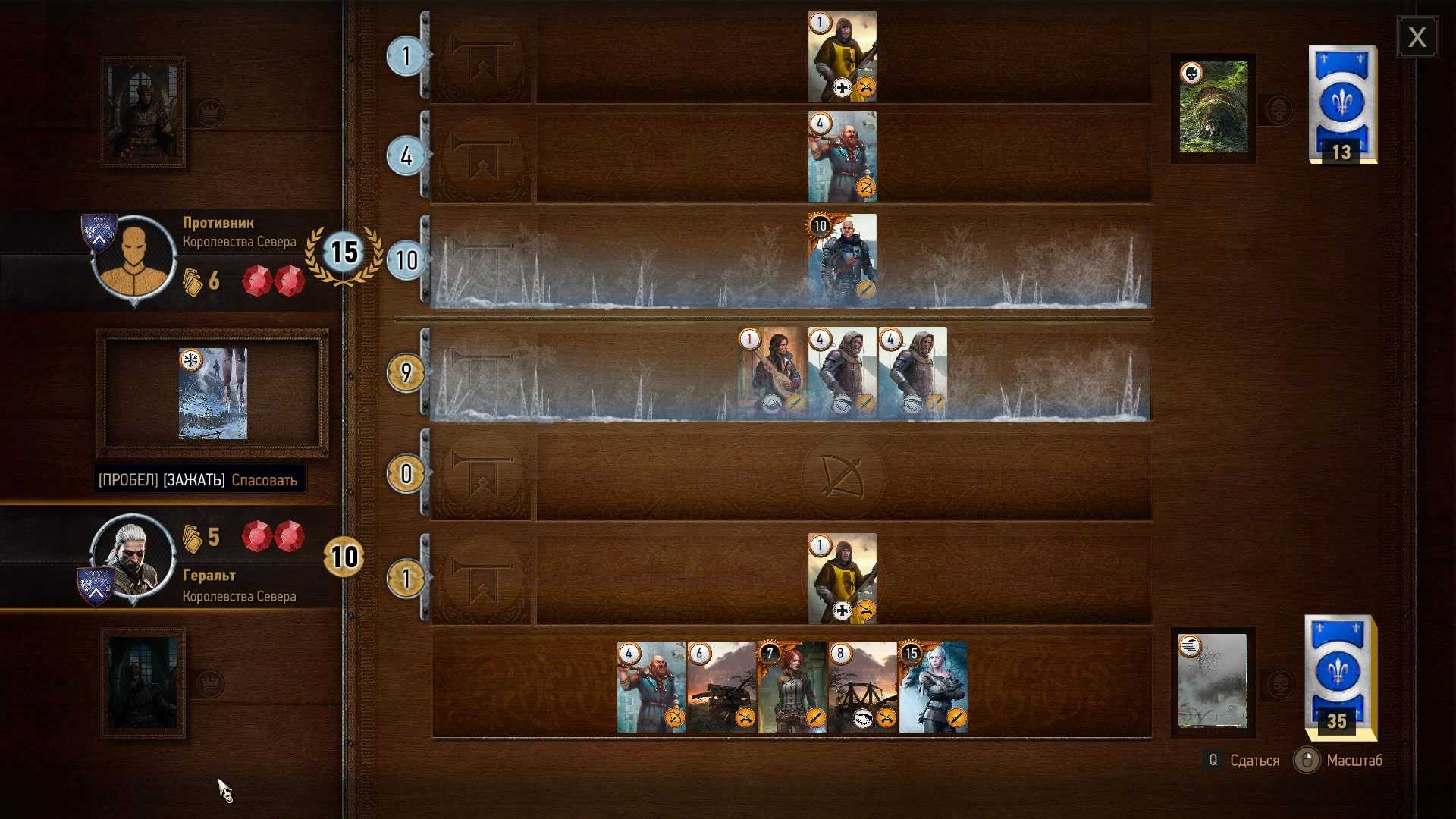- В первом раунде мы подкидываем противнику шпионов (если есть), сливаем все оказавшиеся на руках погодные карты (если есть) и используем лидерскую способность «Король Темерии» (она точно есть у доступной по умолчанию карты лидера). После этого начинаем ставить карты отрядов с минимальной силой. Цель — заставить противника при совершении ответных ходов тратить впустую свои карты отрядов. Почему впустую? Потому что первый раунд мы целенаправленно сливаем и не собираемся выставлять против оппонента более-менее нормальные карты. Поэтому после того как в руке кончатся все погодные карты и карты отрядов с силой в 1-4 единицы жмем «Пас» и даем ИИ выиграть.
