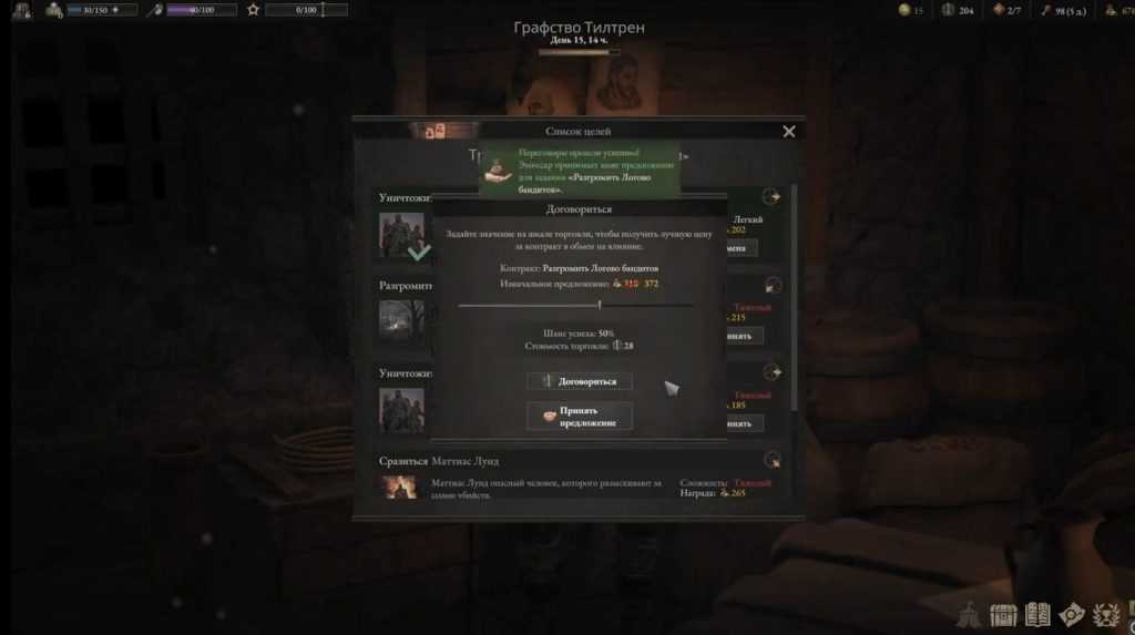 Итак, прокачали торговлю и процветание до 2 уровня, мы получаем возможность обсуждать миссии в списке целей. А это уже дает способность «Договариваться» при начале выборе побочного задания в трактире. Выбираем задание, нажимаем принять и перед нами будет кнопка договориться. Нажав договориться можно повысить количество зарабатываемых крон после выполнения задания и это очень приличное повышения дохода. Единственное, что нужно, это хорошее количество очков влияния, так как работает договоренность за плату.