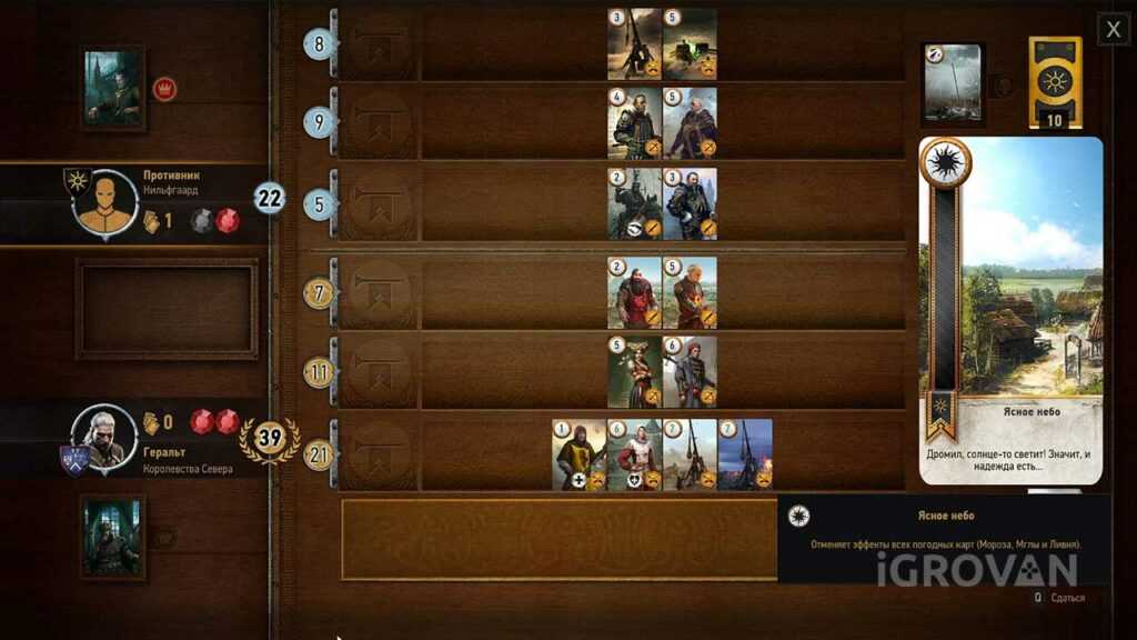 - Уберите из колоды карты «Ясное небо». Отменить действие погодных карт теперь можно с помощью карты лидера и нет смысла держать эти карты в колоде.