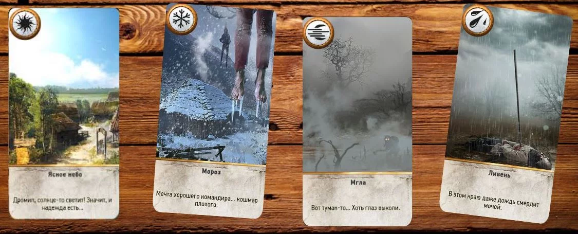 Погодные карты — это действия, которые влияют на все поле. Например, карты с эффектом мороза понизят эффективность бойцов ближнего боя, а туман, наоборот, снизит видимость для лучшиков. Дождь же пагубно скажется на работе осадных орудий, и все это вы можете и должны использовать в своей тактике, опираясь на происходящее на доске.