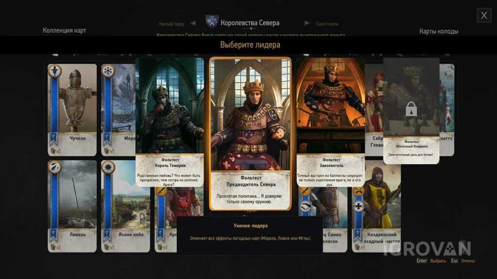 - В качестве карты лидера выберите купленную карту Фольтест Предводитель Севера. У противника в колоде будет много погодных карт, действие которых можно будет отменить в самом конце игры.