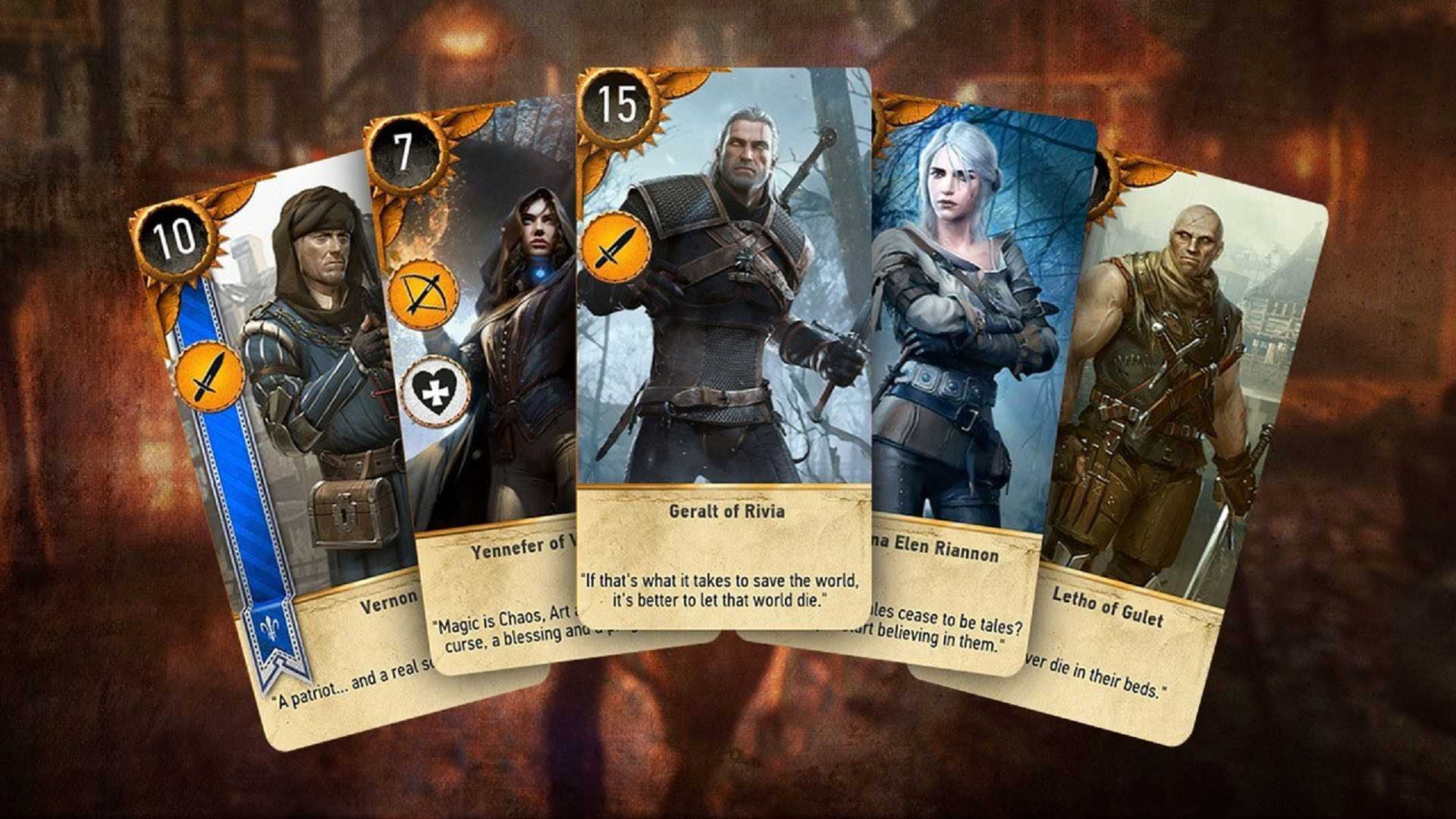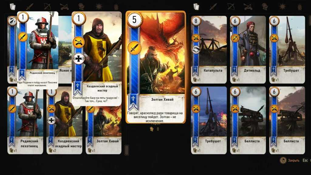 В итоге, со временем вы получите полную коллекцию, которая содержит 180 карт: сюда входят по 37 штук в колодах «Королевства Севера», «Нильфгаарда» и «Скоя’таэли»; 40 — относятся к сборнику «Чудовища» и оставшиеся 29 — находятся в собрании «Нейтральные» и «Специальные». Начиная игру, прежде всего, придется сражаться с помощью «Королевства Севера». Получая уровень и все более сложных соперников, вам понадобятся мощные карты. Если же вы не будете уделять время сбору и погоне за редкими юнитами, то к 12 уровню у вас с легкостью накопятся еще две колоды: «Нильфгаарда» и «Скоя’таэли».