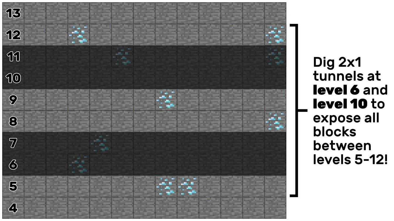 Если вы будете копать 2 туннеля друг над другом, на 6 и 10 высоте, то вы увидите почти все алмазы, находящиеся в этом месте. Это очень удобный способ для поиска алмазов вместе со своим другом.