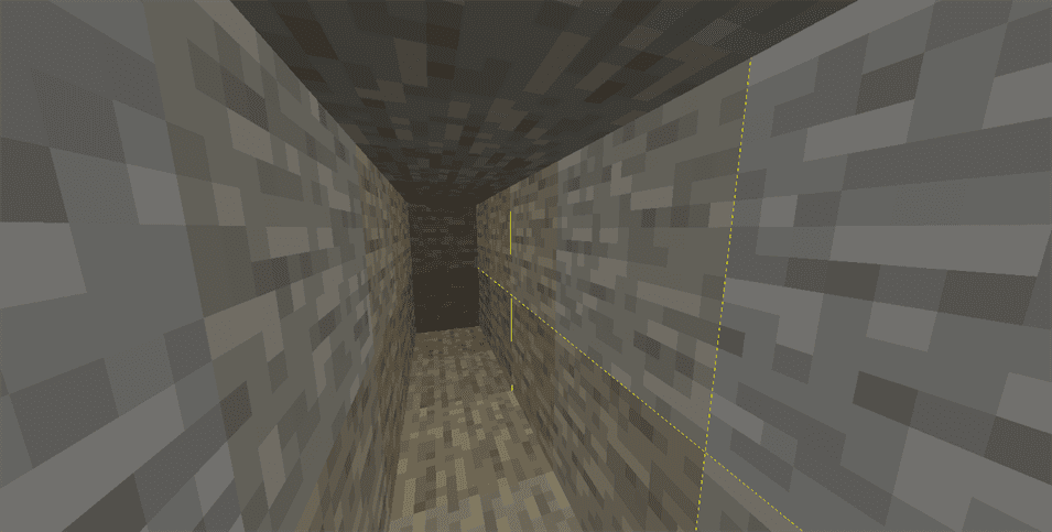 Чтобы у вас было больше шансов найти алмазы, копайте туннель 2×2 так, чтобы граница чанков проходила прямо посередине туннеля, как показано на картинке.