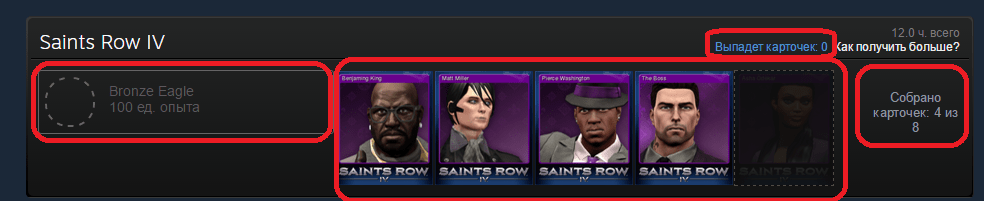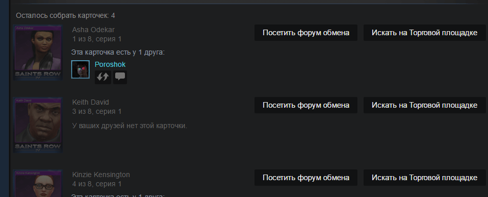 Каким образом можно получить недостающие карточки? Одним из способов является обмен с другом. Например, вы собираете карточки для «Saints Row 4», вам не хватает 4 карточек, но при этом у вас есть карточки для других игр. Но, значки к этим играм вы не собираете, тогда вы можете обменять ненужные карточки на карточки «Saints Row». Для того чтобы посмотреть какие карточки есть у ваших друзей, необходимо кликнуть на панель сбора значка левой клавишей мыши.
