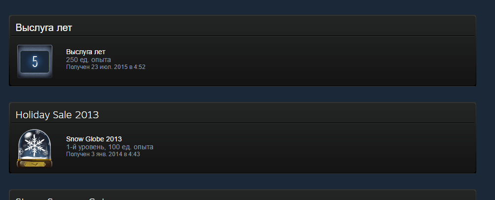 В качестве примера таких значков, можно привести «выслугу лет», которая дается за время с момента создания аккаунта в Стиме. Другим примером может служить значок «участие в летних или зимних распродажах». Для получения таких значков необходимо выполнять действия, список которых указан на панели значка. Например, в ходе распродаж необходимо голосовать за игры, которые вы бы хотели видеть со скидкой. После того как наберется определенное количество голосов на вашем аккаунте, вы получите значок распродажи.