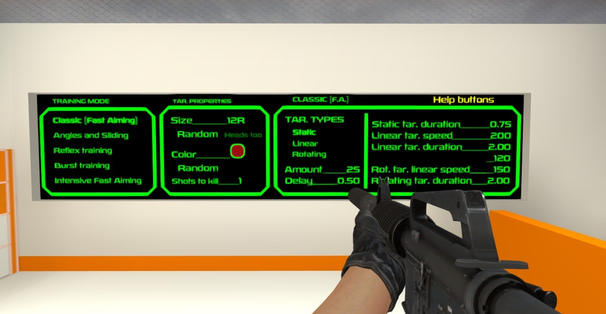 - training_aim_csgo2. Это карта содержит несколько основных режимов, которые помогут вам тренировать реакцию и фликинг. По центру области будут появлятся мишени, по которым вы должны попасть либо за время, либо, чтобы они не заполнили весь экран. Желательно выбивать 100-200 мишеней в день, постепенно уменьшая диапазон появления и размер мишеней (регулируется на карте). Соответственно, делать это можно из одного оружия.