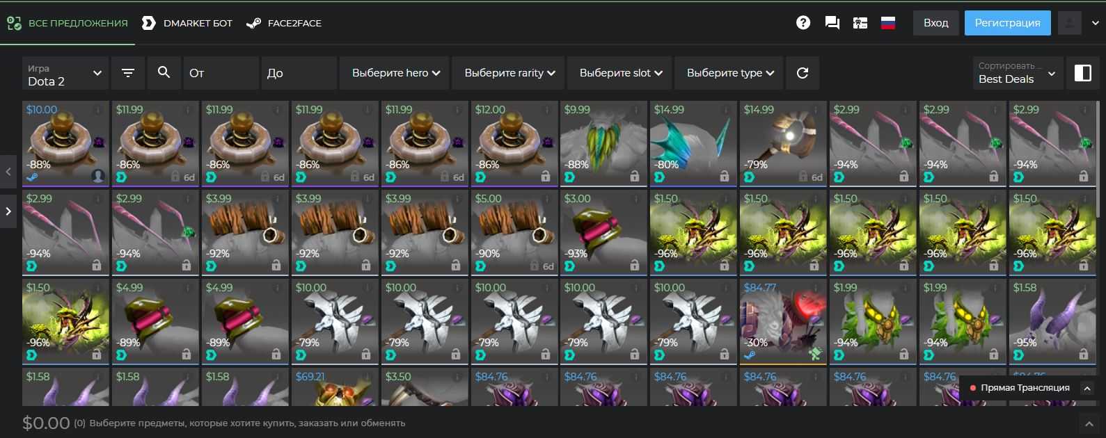 Dmarket — прекрасный сайт, где можно максимально выгодно продать свои вещи из Dota 2 и CS:GO. Ресурс можно считать зарубежным, поэтому здесь работают правила свободной продажи. То есть сайт не занимается скупкой предметов, чтобы их потом перепродать другим пользователям. Здесь все устроено слегка по-другому. Ресурс находит покупателя, а уже потом продавца. Они самостоятельно договариваются о цене, а потом оплата производится с помощью сайта. Никакого обмана, ведь ресурс выступает в роли гаранта.