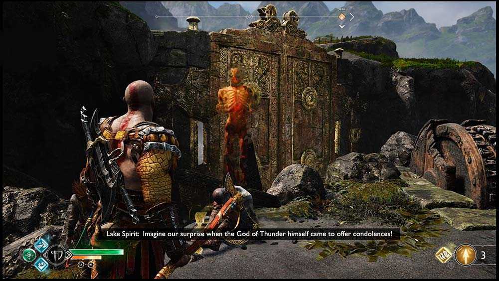 По мере продвижения вверх по Стоун-Фолс и поравнявшись с вершиной водопада, вы встретите оранжевого духа, который попросит вас уничтожить статую Тора над могилой его отца в обмен на получение его благословения на разграбление могилы. Вам нужно будет открыть дверь в Вейтургард, чтобы получить доступ к статуе, а элементы управления дверями также находятся в Стоун-Фоллс. Идите к статуе Тора посреди озера Вейтургард, уничтожьте ее, швырнув свой топор в светящиеся осколки, а затем доложите духу, чтобы успокоить его.