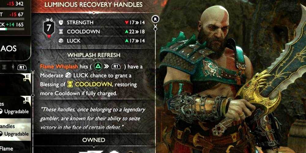 Возможно, Кратос не является азартным игроком и не знает, что такое азарт, но Светящиеся рукоятки восстановления принадлежали легендарному азартному игроку. Вот почему в этих рукоятках приоритет отдается удаче и используются Обновление хлыста. Этот перк означает, что у Flame Whiplash, способности, используемой с треугольником и R1, будет хороший шанс получить Blessing of Cooldown, который позволяет способностям Cooldown полностью зарядиться. Способности замедления — отличный способ поддерживать бой. У Кратоса много отличных световых и тяжелых рунических атак в игре God of War: Ragnarokи все они имеют время ожидания после использования. С помощью светящихся ручек восстановления игроки могут сократить время действия способностей, а найти эти ручки можно в Легендарный сундук в СвартальфхеймеВ сундуке можно найти эти рукоятки в Легендарном сундуке в Свартальфхейме, с приличным количеством Силы, Выдержки и Удачи.