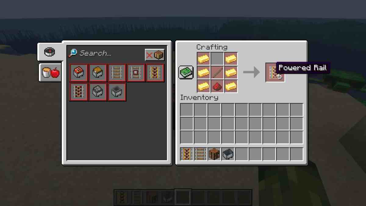 Простая тележка, даже если она установлена на рельсы, не сможет поехать сама по себе, а это значит, что нам потребуется либо вагонетка с мотором, либо электрические рельсы. Поэтому надо научиться их крафтить. Но хочется сразу заметить, что их создание потребует много ресурсов: 6 слитков из золота, красный камень и палка.