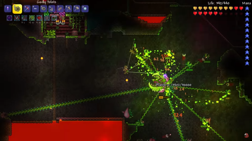 Для тех, кому неважно, как убивать плантеру в Террарии (с воздуха, с земли или с использованием багов), есть и другой способ, предусматривающий выкапывание обширной сети туннелей под джунглями. Все они должны образовывать окружность, по которой будет бегать игрок, время от времени кидая в босса грибное копье